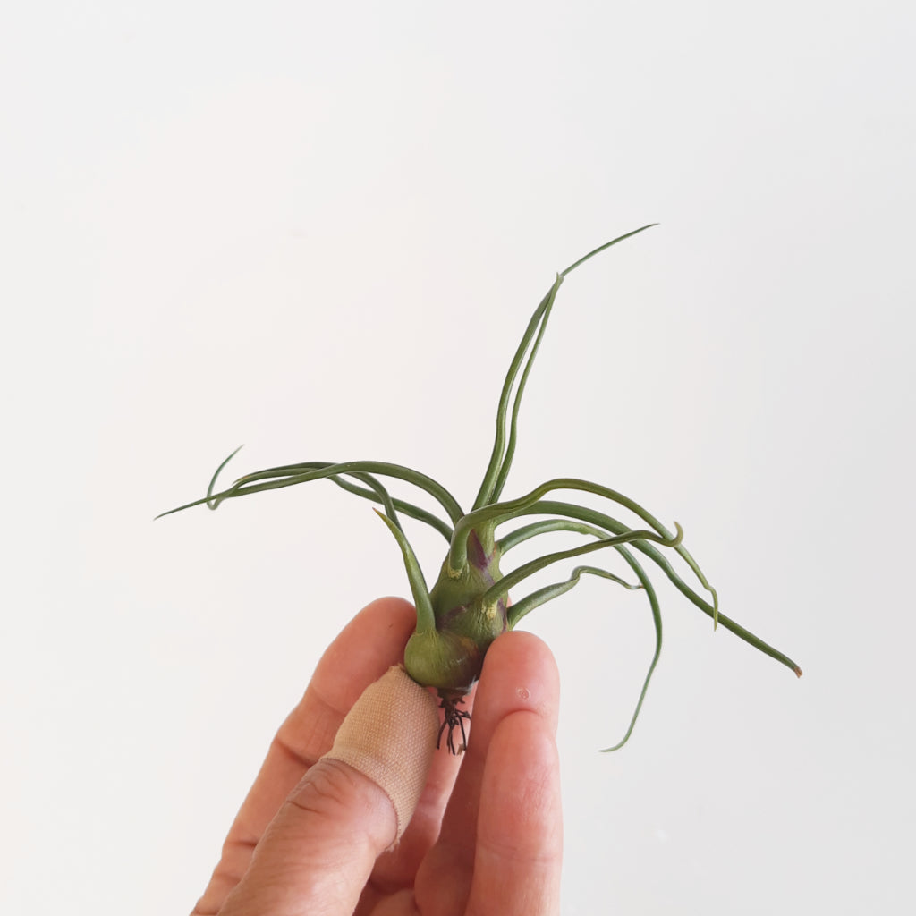 An interesting looking air plant with a bulbous base and curly, bright green leaves that blush deep red prior to blooming.